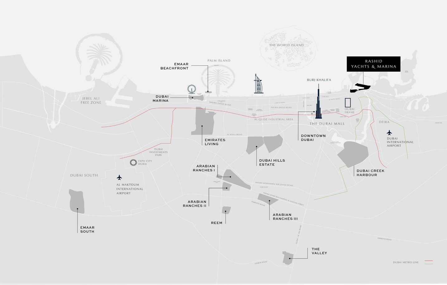 Strategically located, Rashid Yachts and Marina is less than 10 minutes from Sheikh Zayed Road, 15 minutes from Dubai International Airport, and 20 minutes from Downtown Dubai and Dubai Mall/Iconic Burj Khalifa.